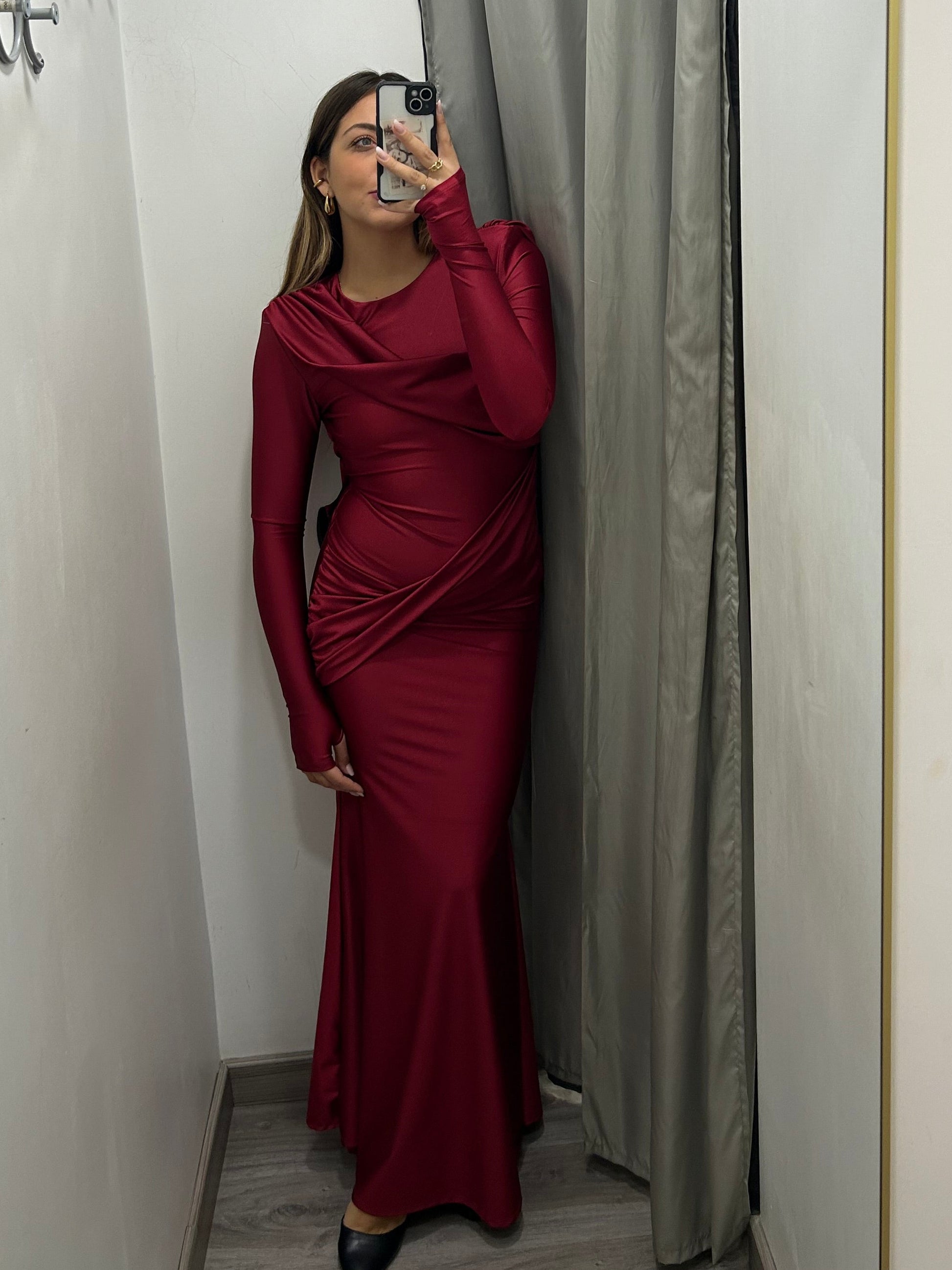 abito lungo in tessuto elasticizzato color bordeaux, caratterizzato da maniche lunghe, da una profonda scollatura sulla schiena e da diversi drappeggi sul davanti. Taglia unica veste fino alla M.