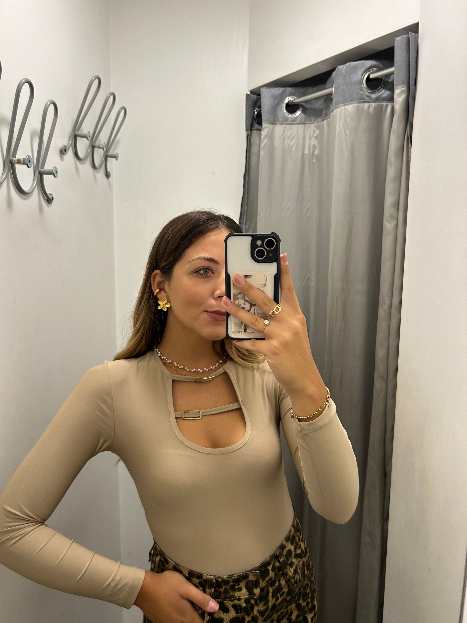 Body in lycra manica lunga, con particolare scollo. Taglia unica