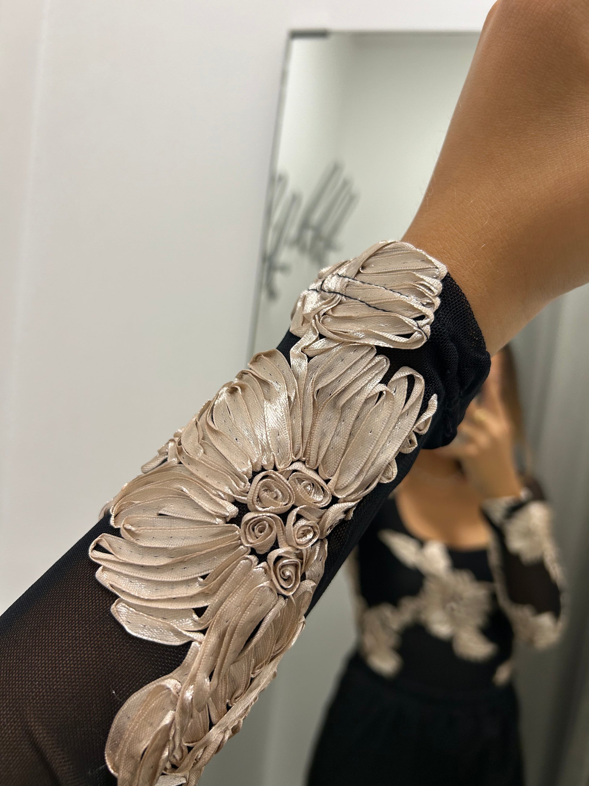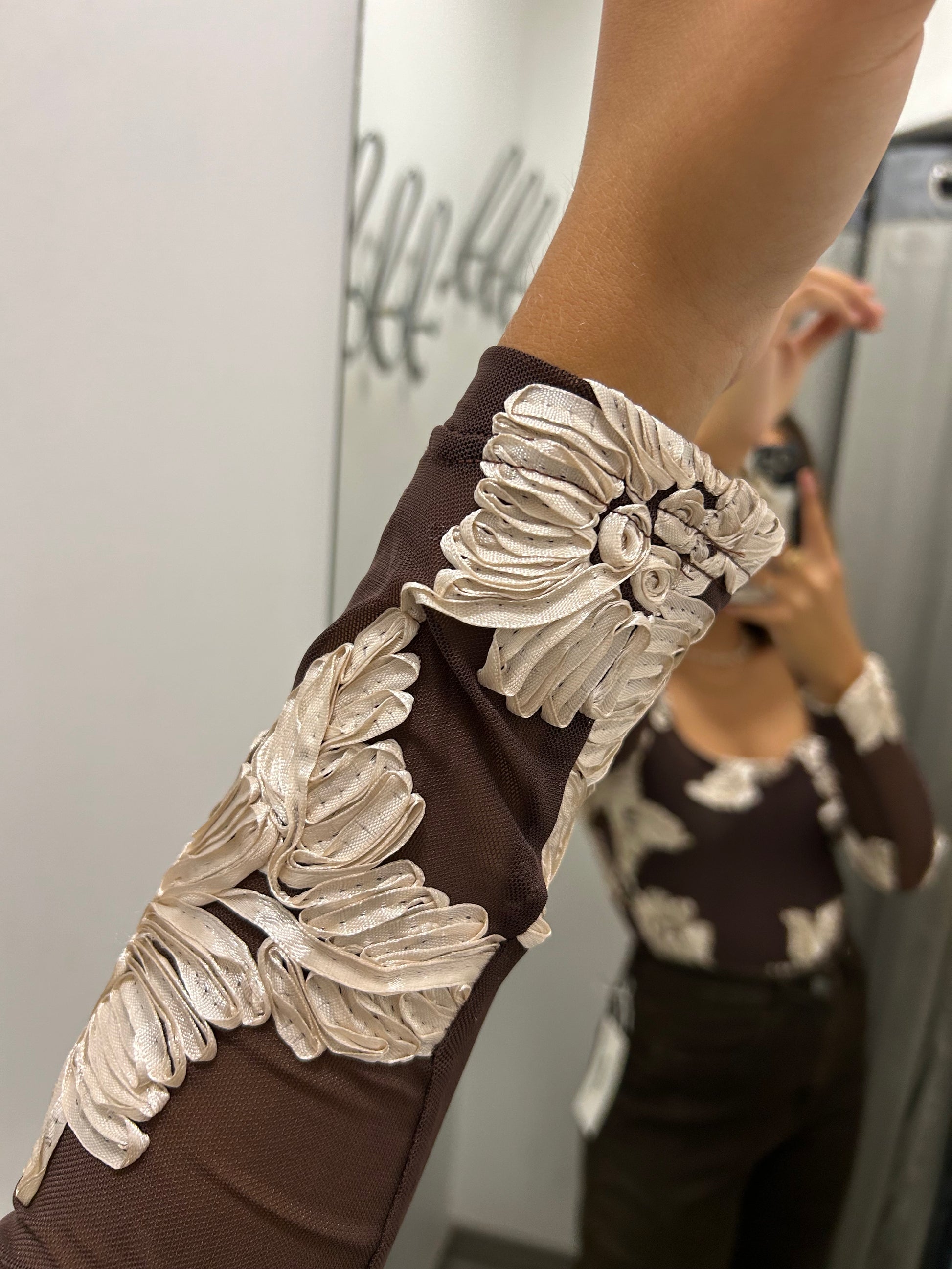 Body in morbido tulle con fiori in rilievo a contrasto, maniche lunghe e scollo quadrato . Taglia unica