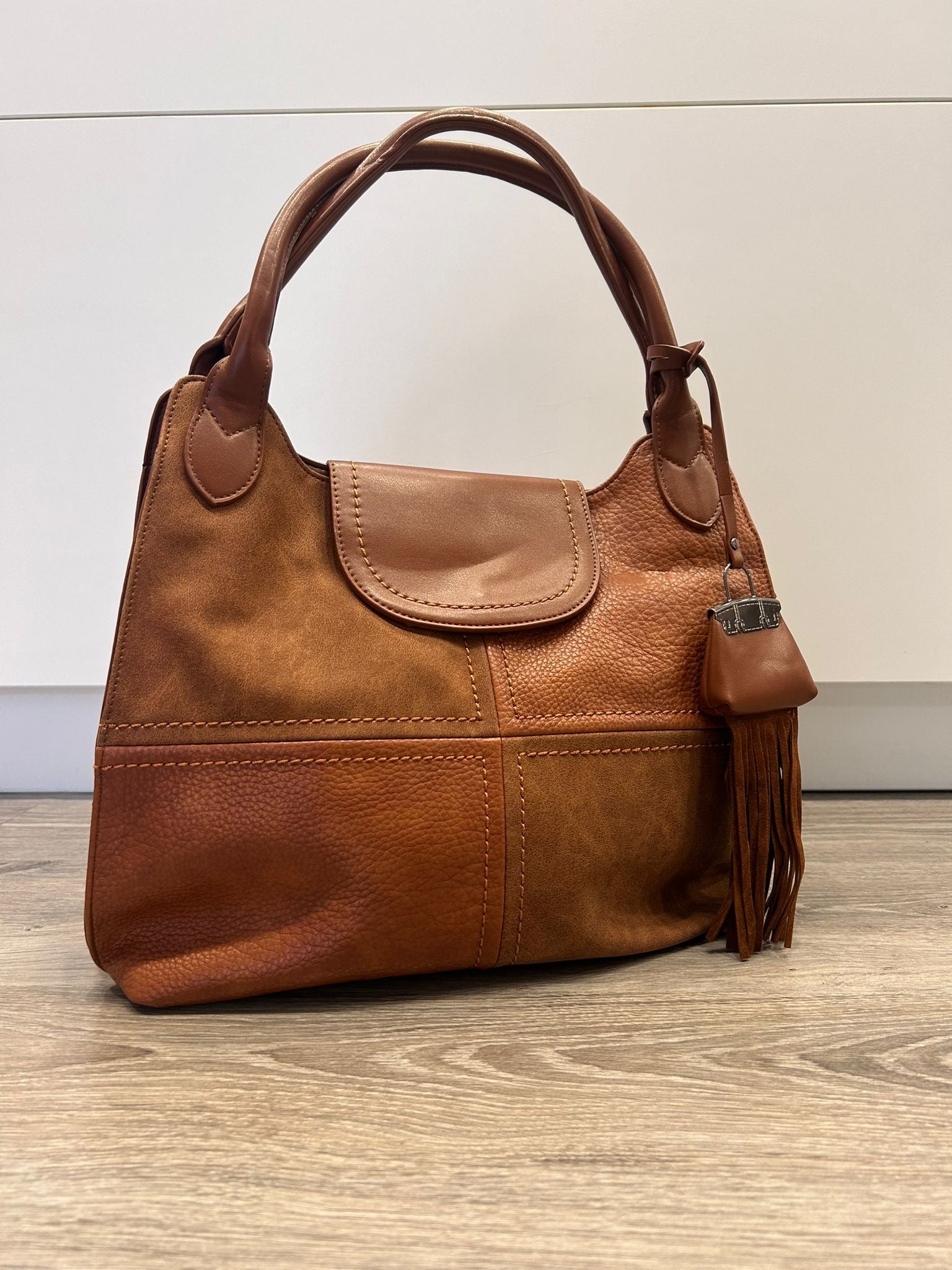 Borsa donna in similpelle e camoscio con comodi manici. Arricchisce la borsa un simpatico ciondolo con frange . Firmata Coveri