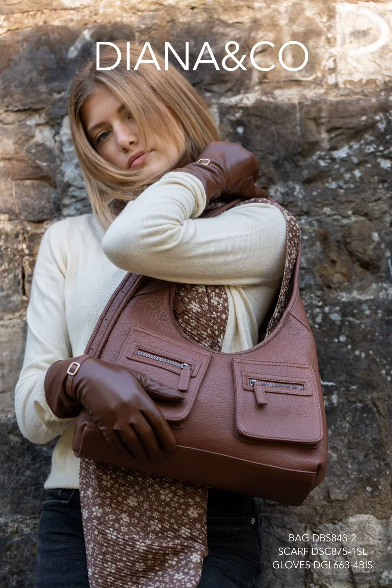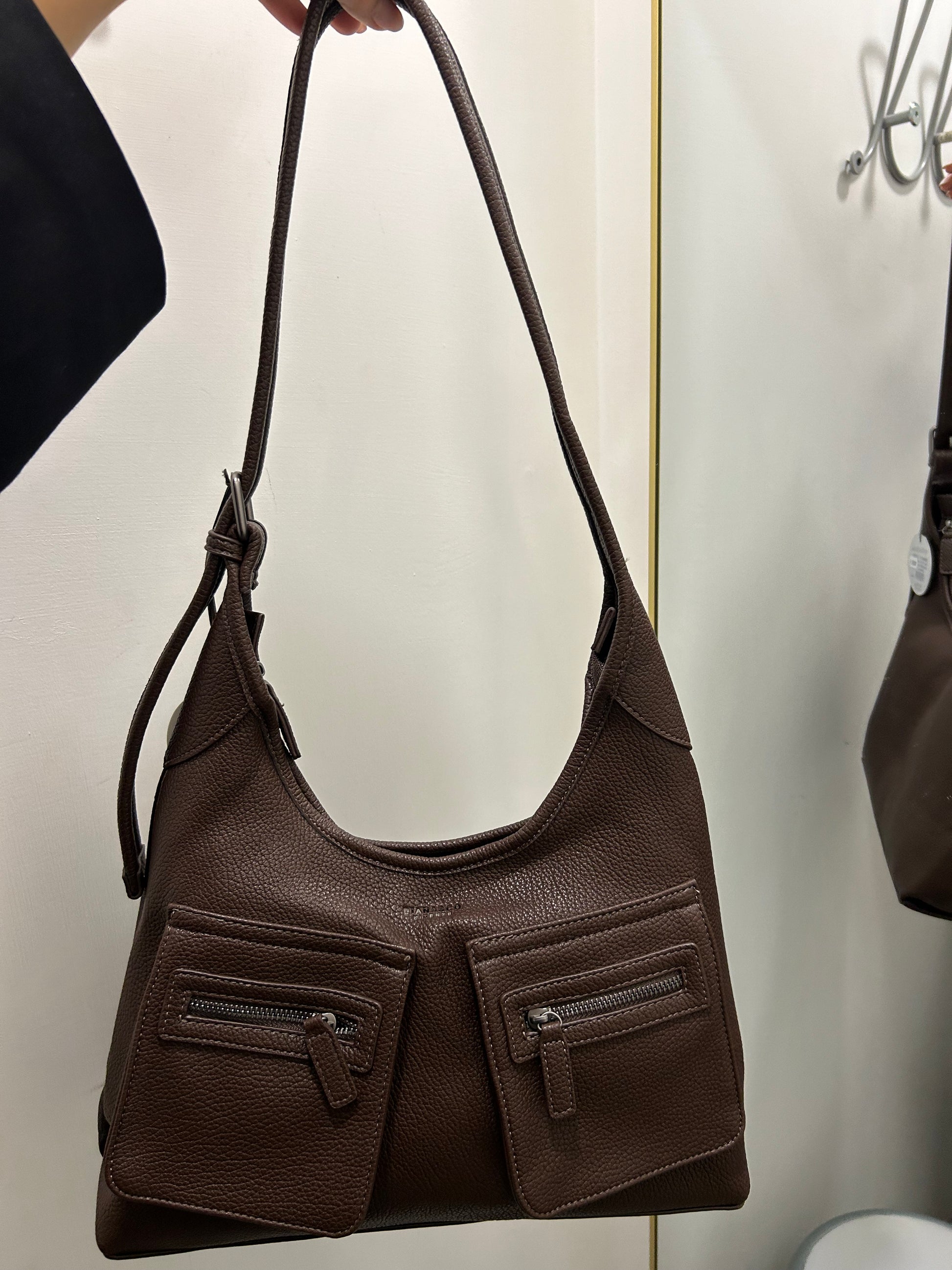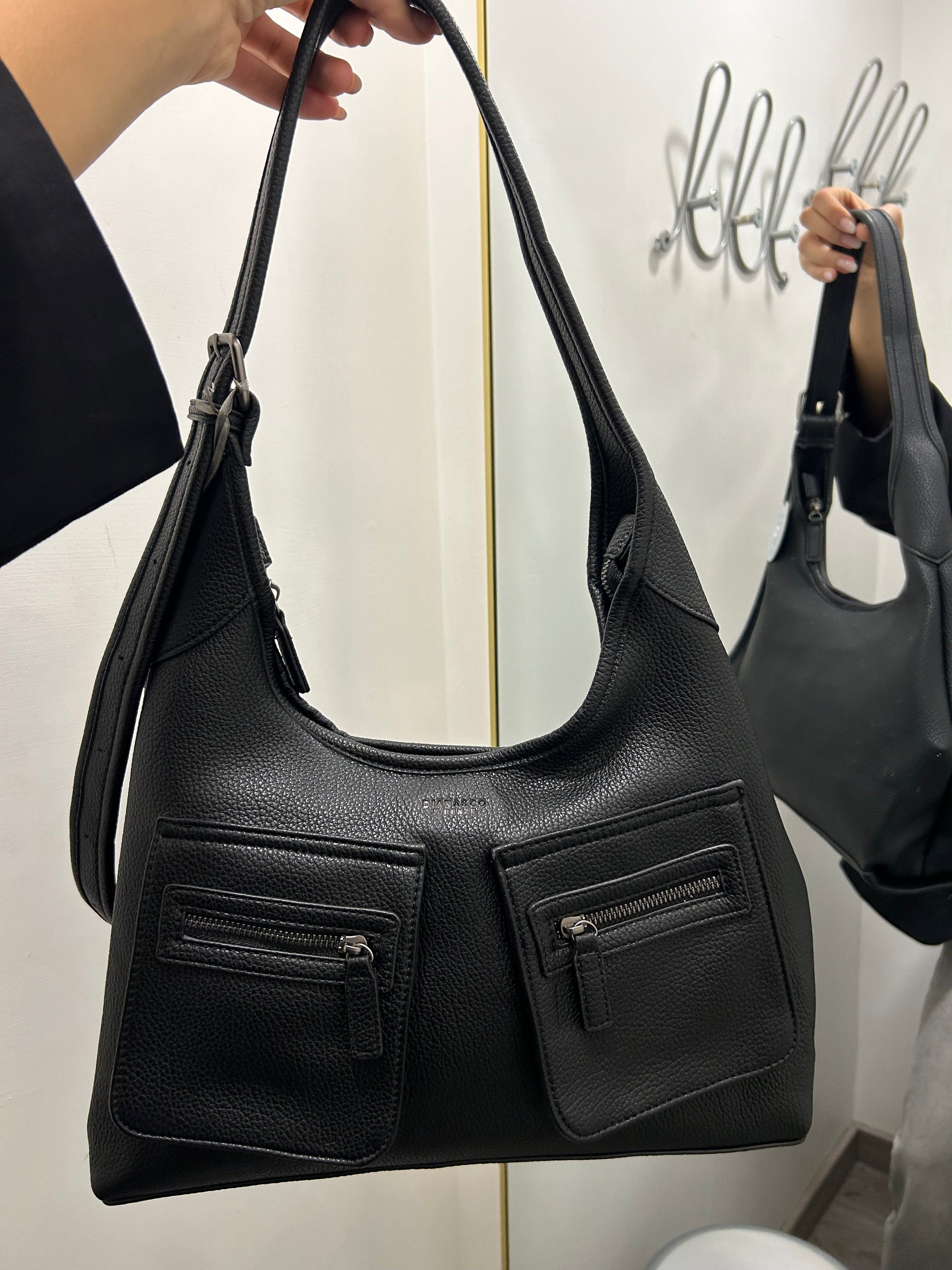 Borsa in pelle martellata con doppia tasca frontale e chiusura a zip, tracolla regolabile.