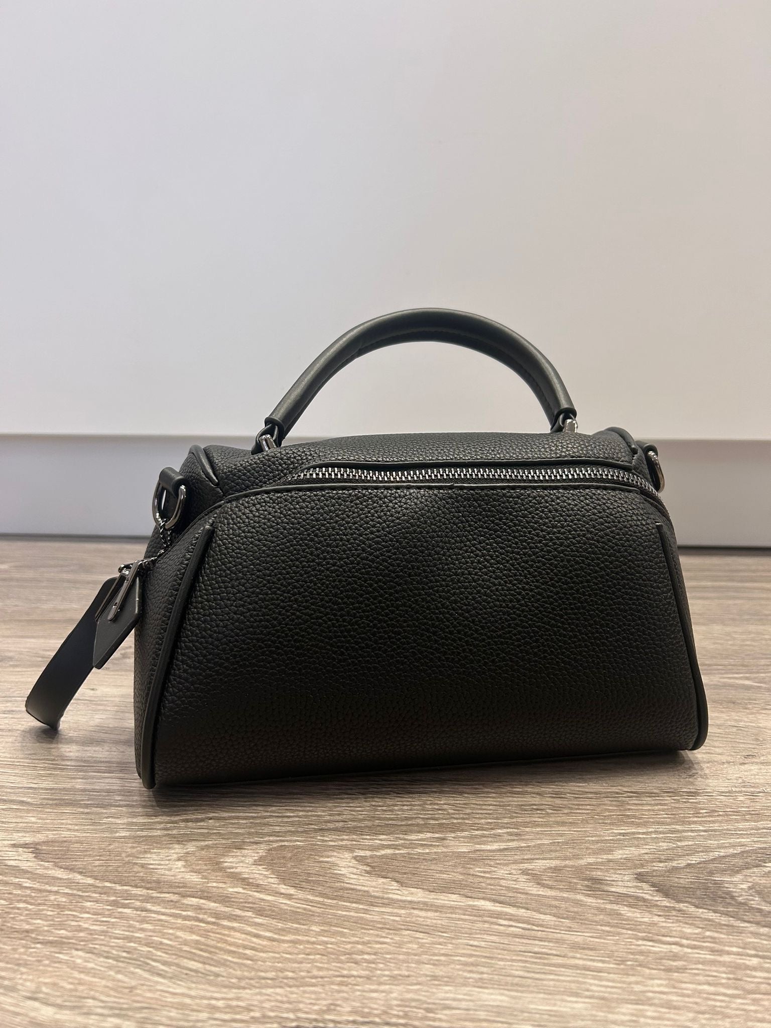Mini bauletto in similpelle con chiusura zip e tracolla regolabile.