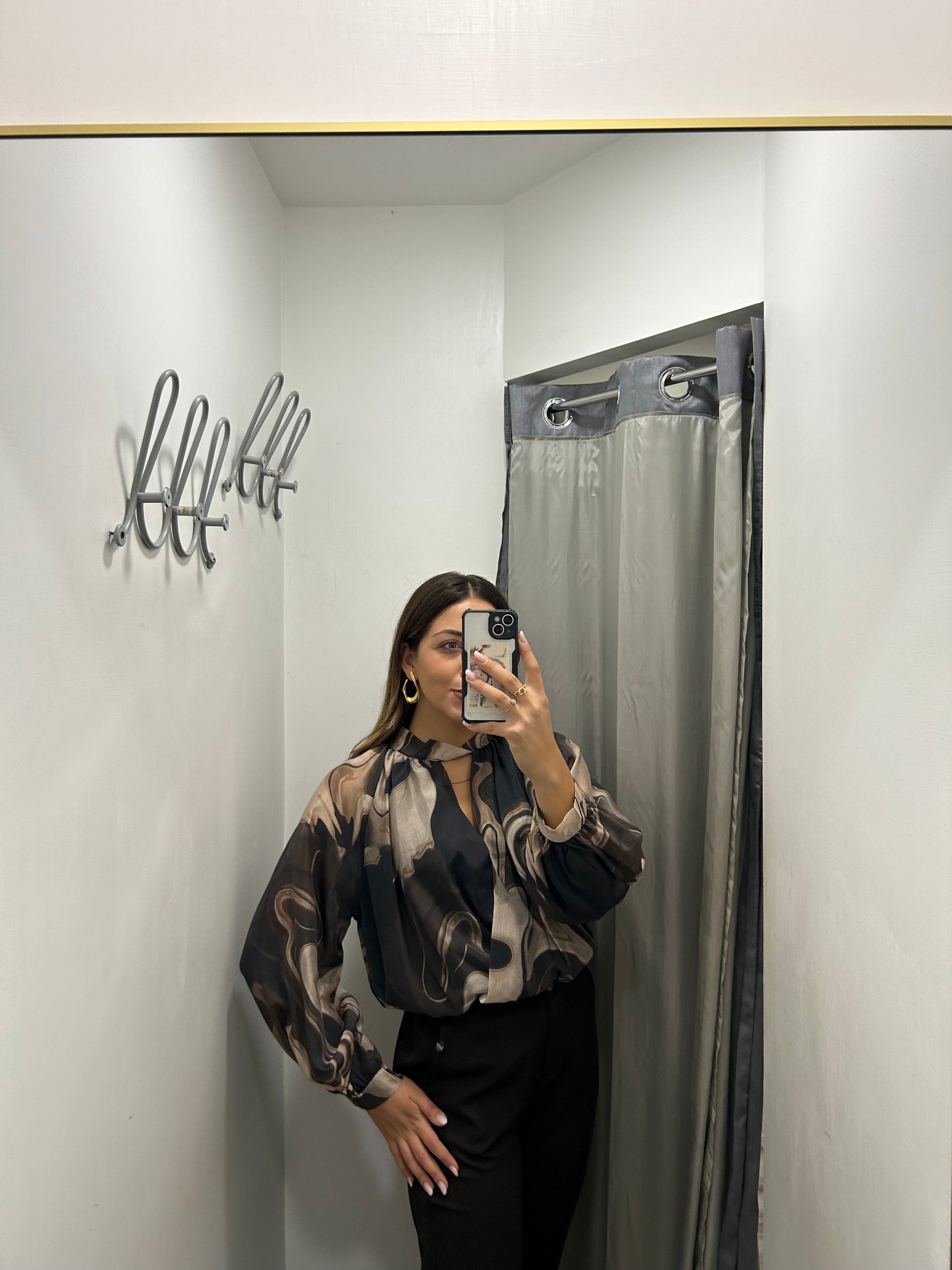 Blusa in tessuto con stampa effetto marmorizzato nei toni del beige, nero e marrone. Linea fluida, maniche ampie con polsini arricciati e collo morbido con apertura a goccia sul davanti.