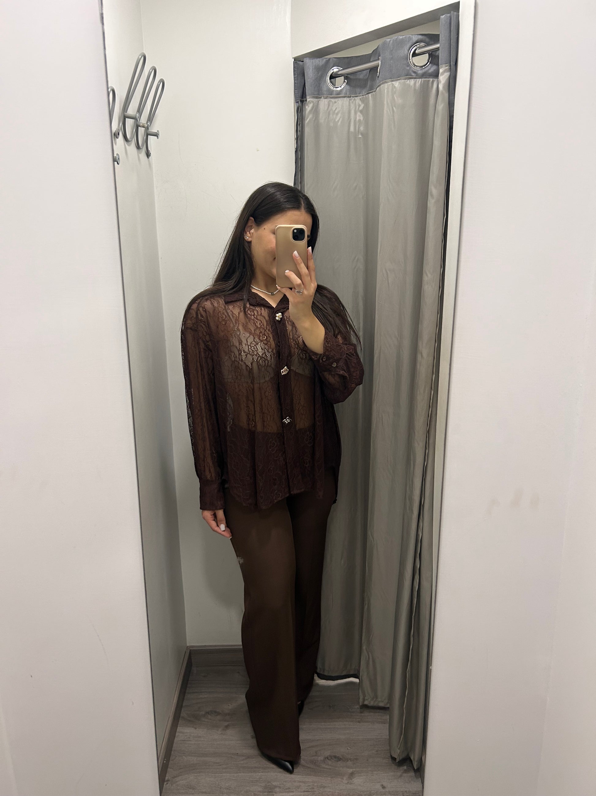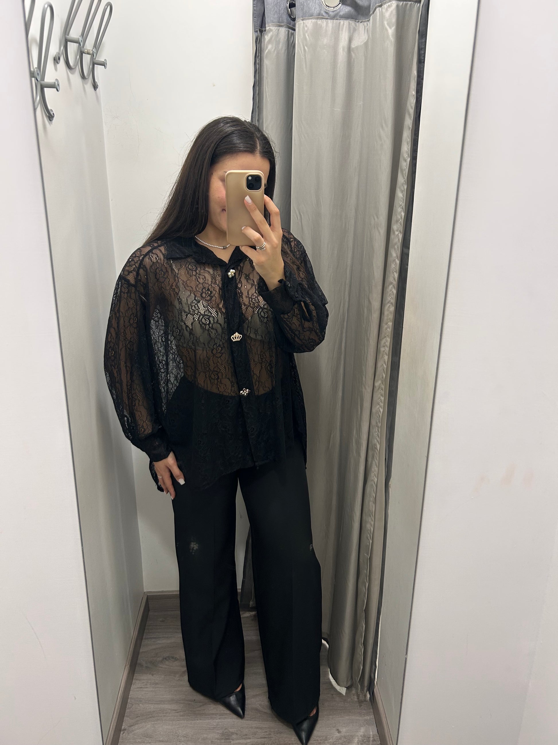 Camicia donna in pizzo modello oversize, abbottonata sul davanti e arricchita con tre spilli gioiello. Taglia unica può vestire fino alla tg52