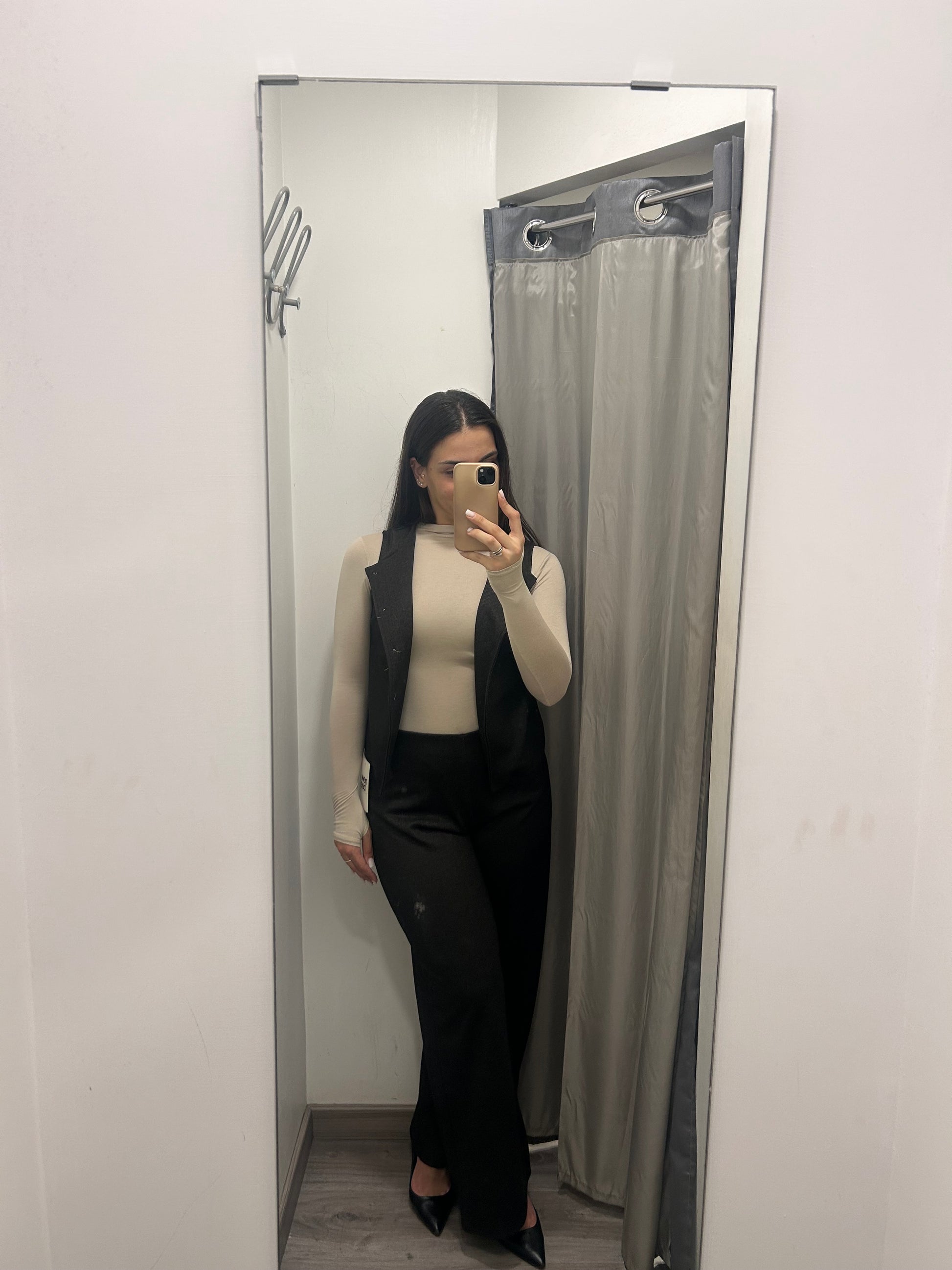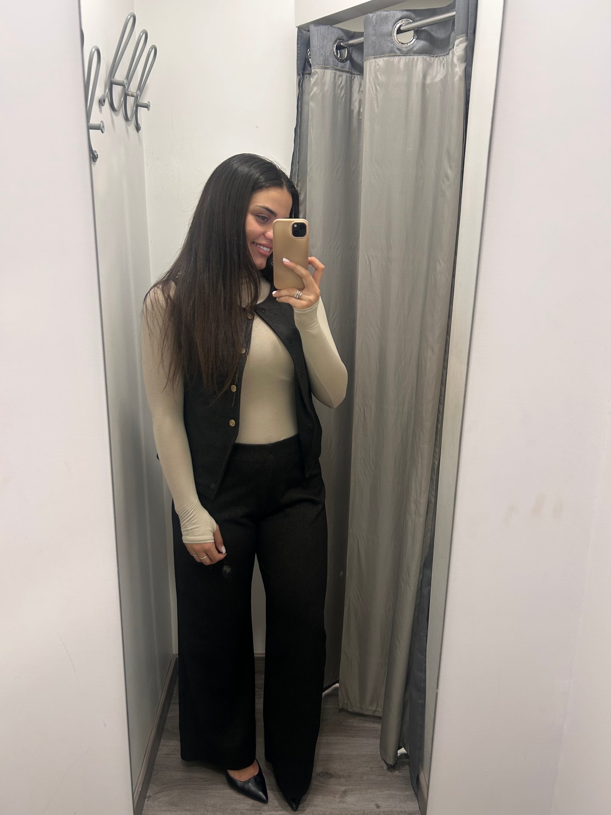 Completo donna con pantalone palazzo elastico in vita e gilet abbottonato con scollo tondo in morbido tessuto punto Rom. Taglia unica veste fino alla tg48/50