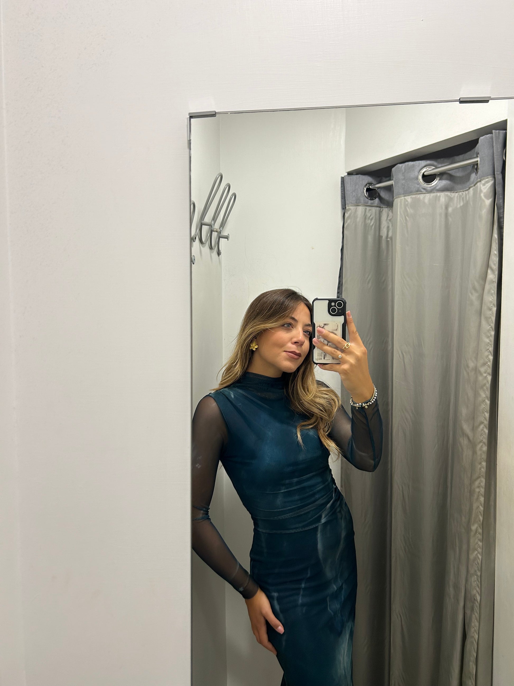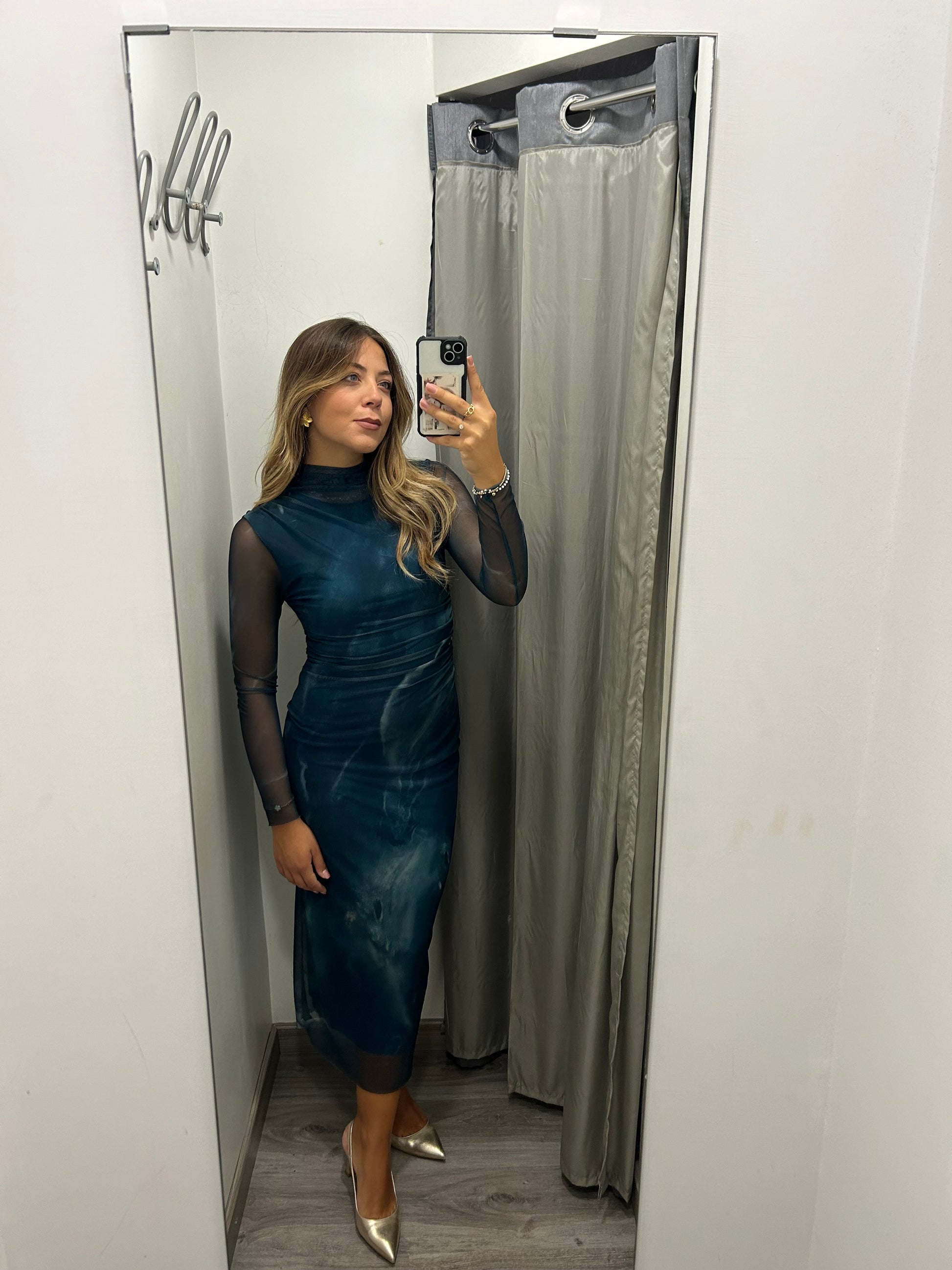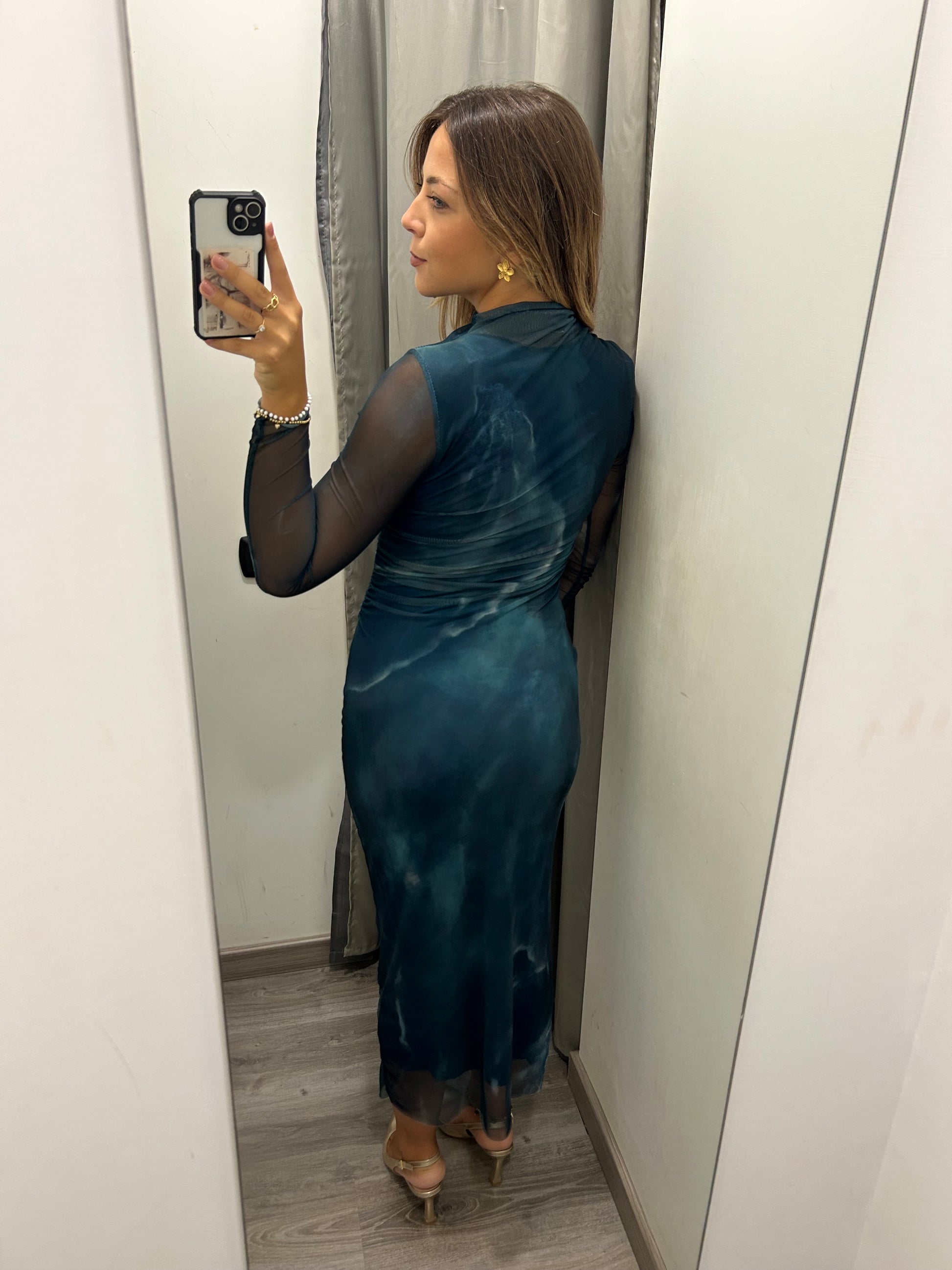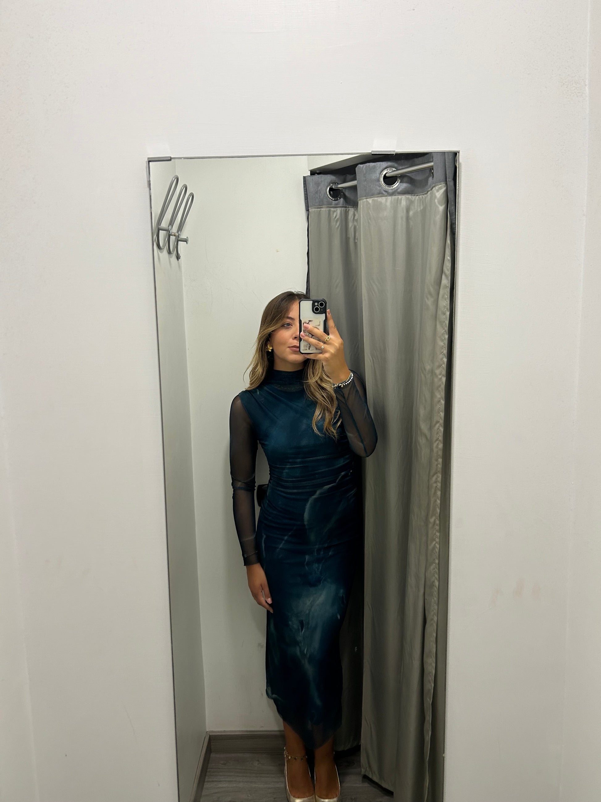 Abito midi in tulle stampato con manica lunga velata. Taglia unica, veste fino alla XL