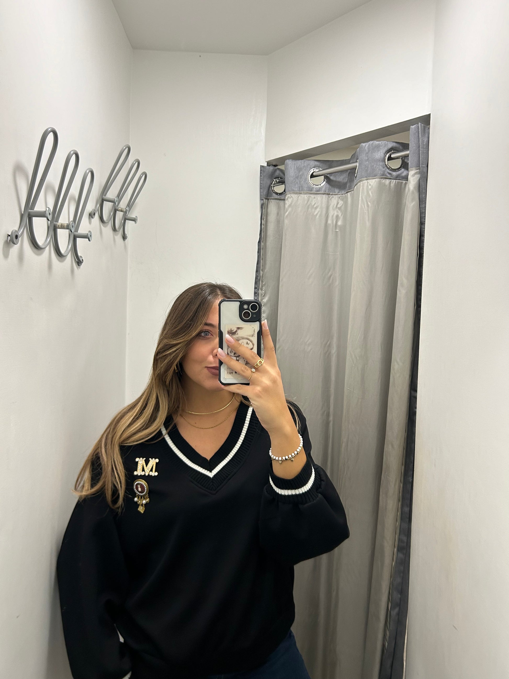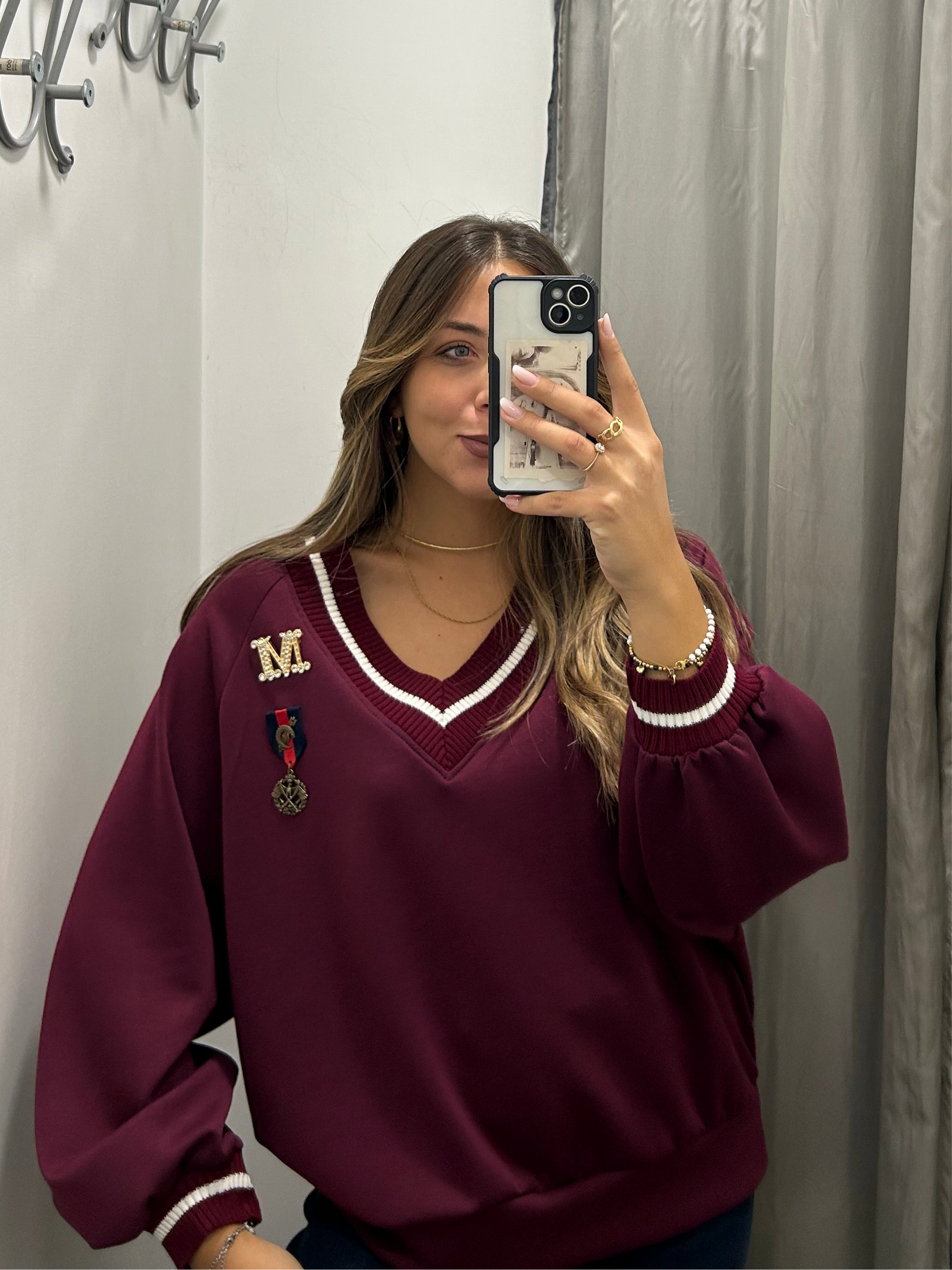 Felpa in viscosa con scollo a V caratterizzata da profili in maglia rigata, con spilli gioiello. Taglia unica, veste anche un XL
