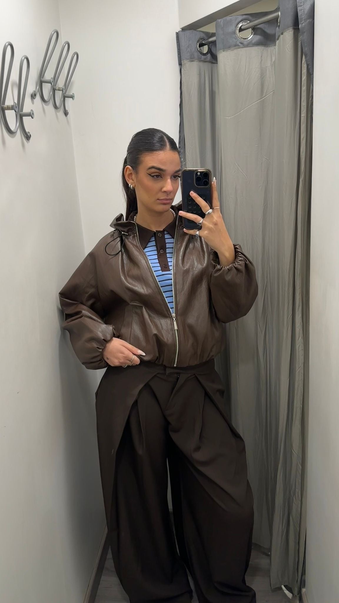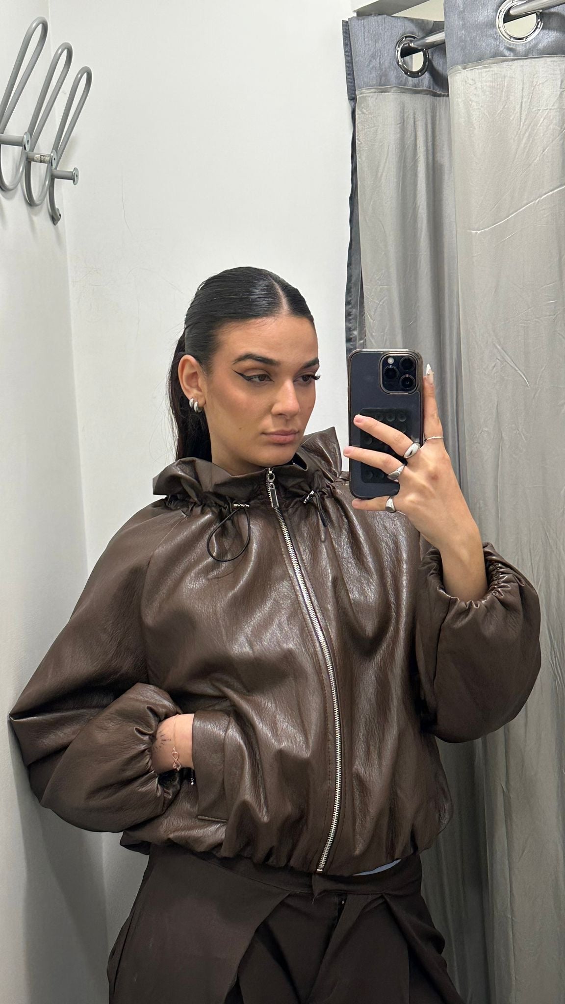 Giubbino donna in simil pelle. Caratterizzato da abbottonatura zip, con collo a rouche . Maniche ampie ed elastico in vita. Taglia unica, veste dalla S alla XL