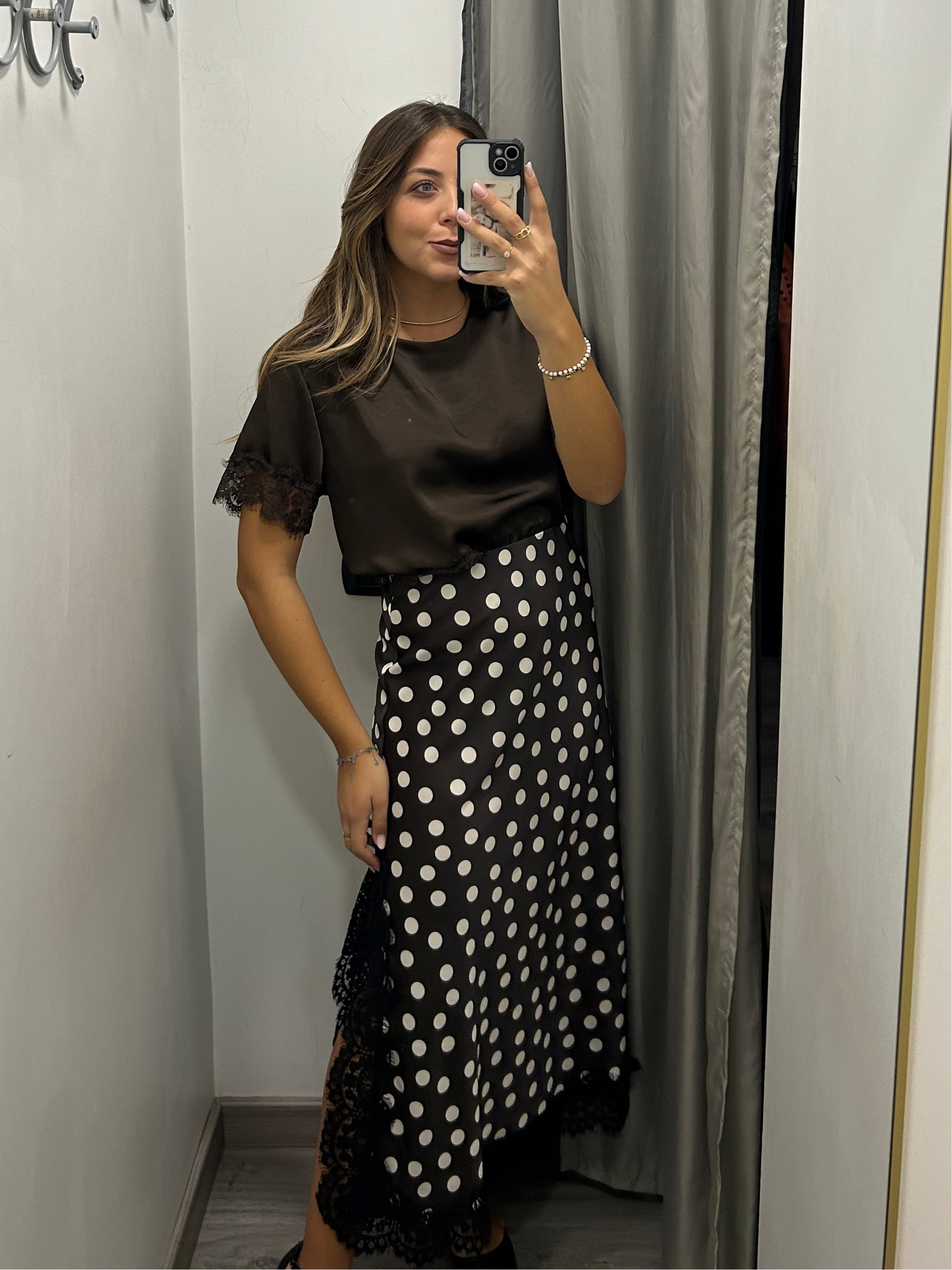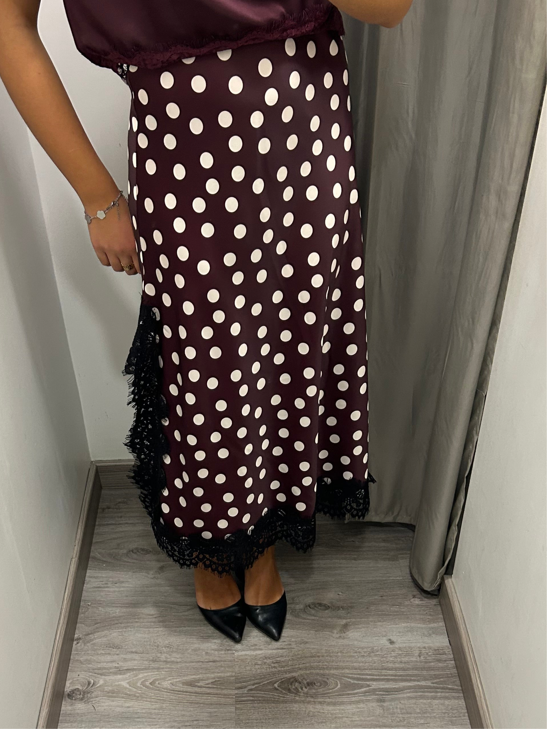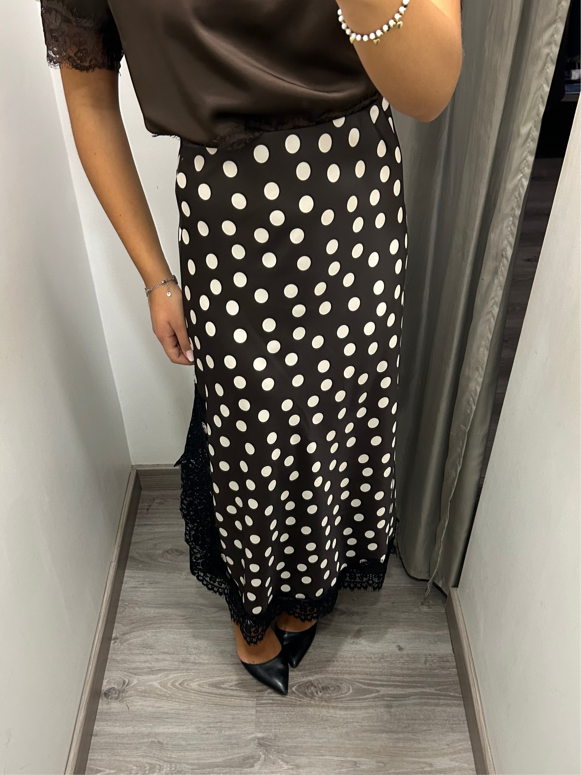 Gonna longuette in morbido raso a pois con bordi in pizzo nero. Taglia unica veste fino alla XL