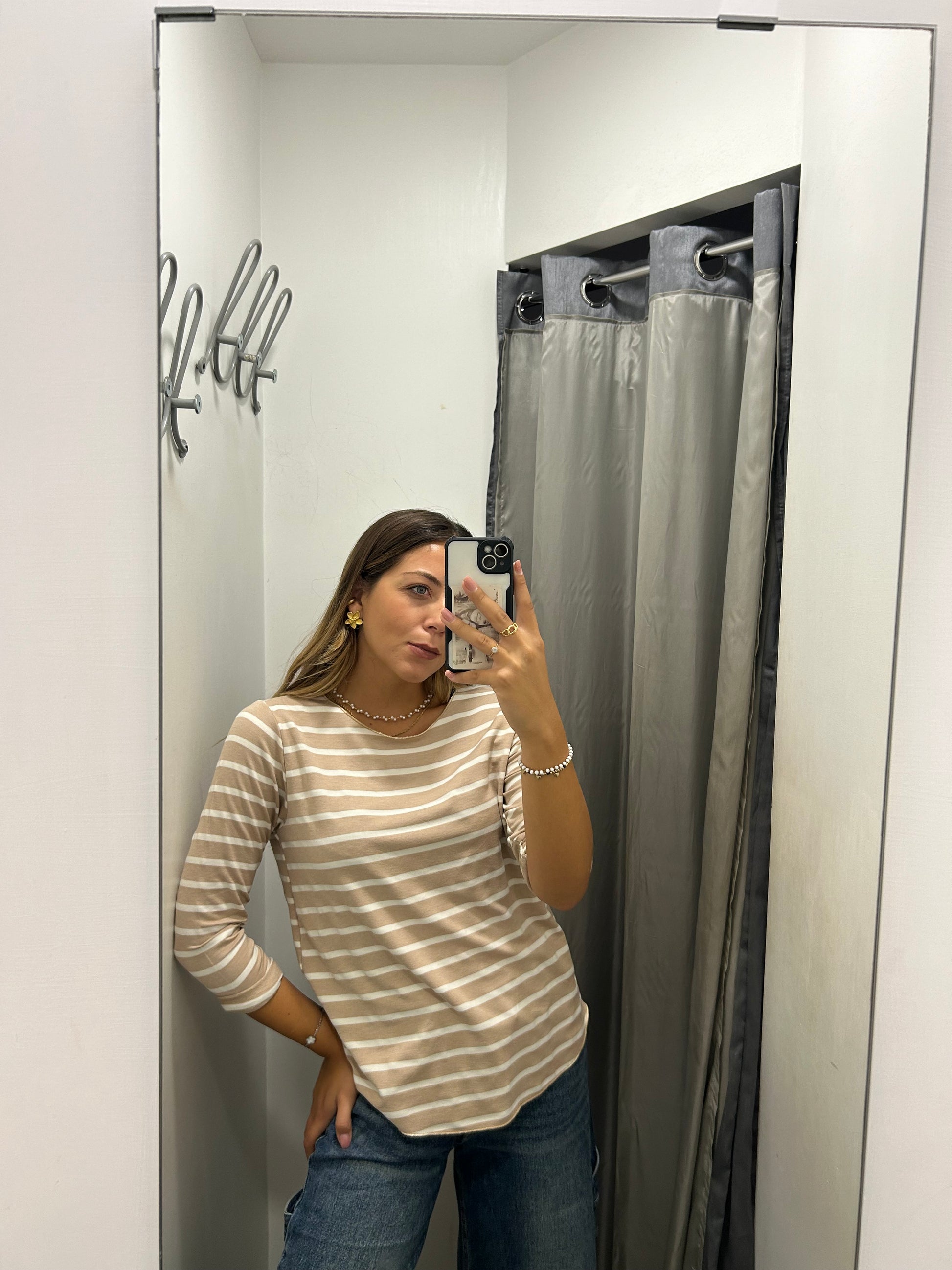 Comoda shirt in cotone manica lunga, a righe orizzontali, non elastica, scollo barca, veste dalla S alla L