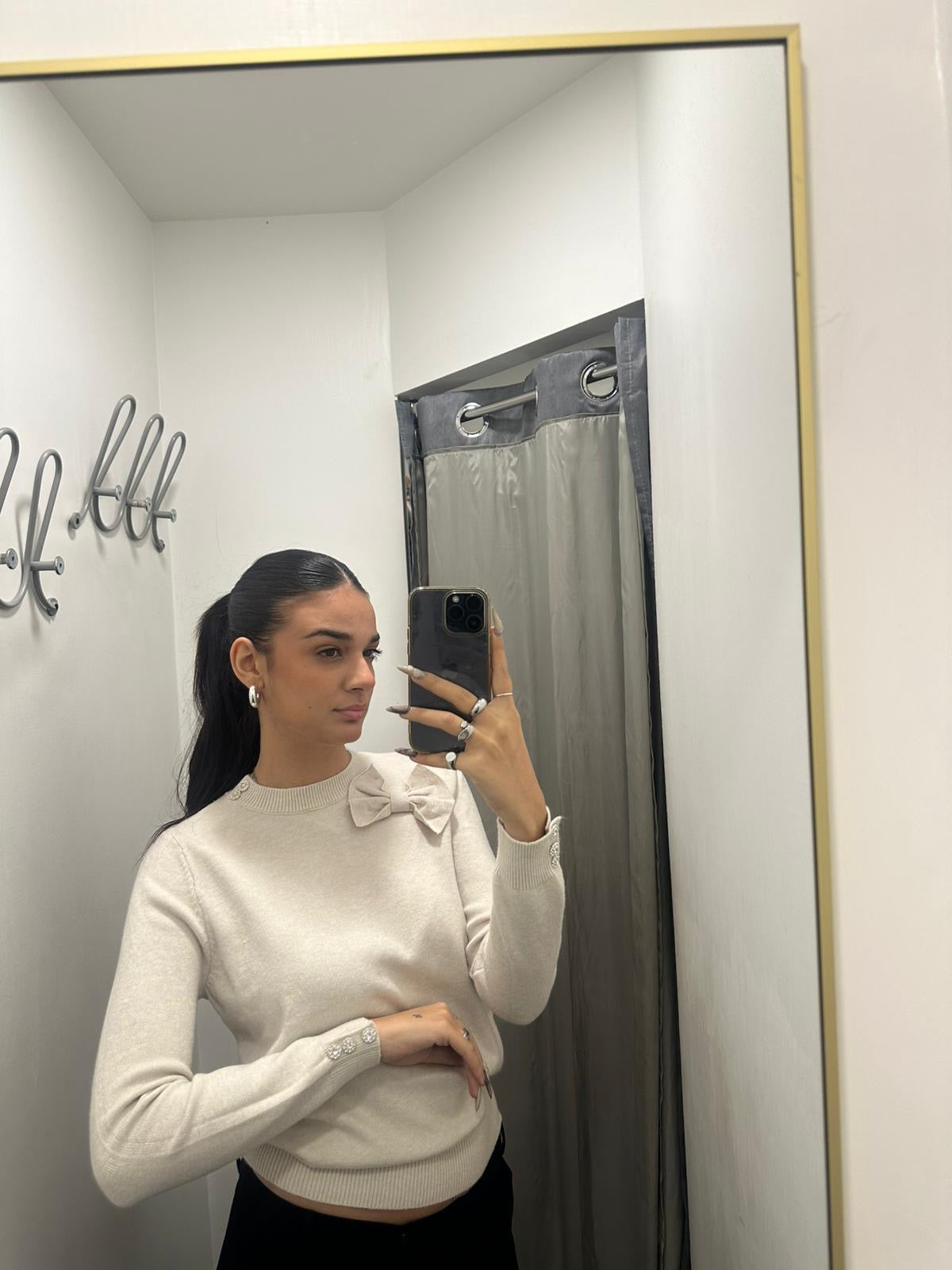Maglioncino donna in morbida lana con applicazione di fiocco dello stesso colore e bottoni gioiello. Veste dalla S alla L