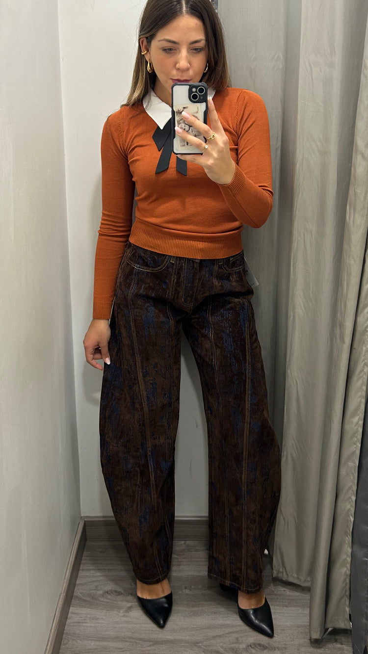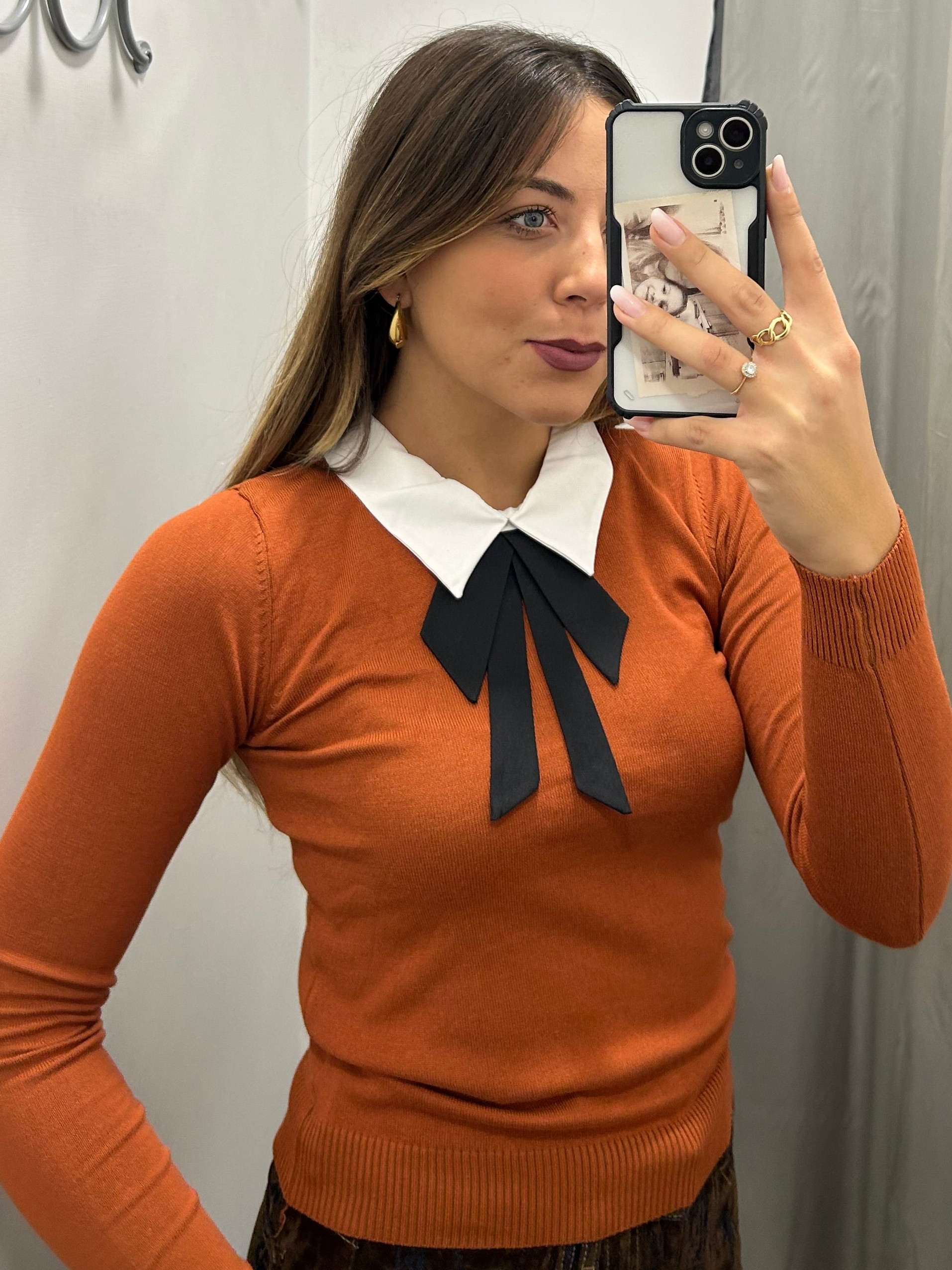 Maglia donna in lanetta leggera con colletto bianco e fiocco nero . Taglia unica. Veste dalla XS alla L