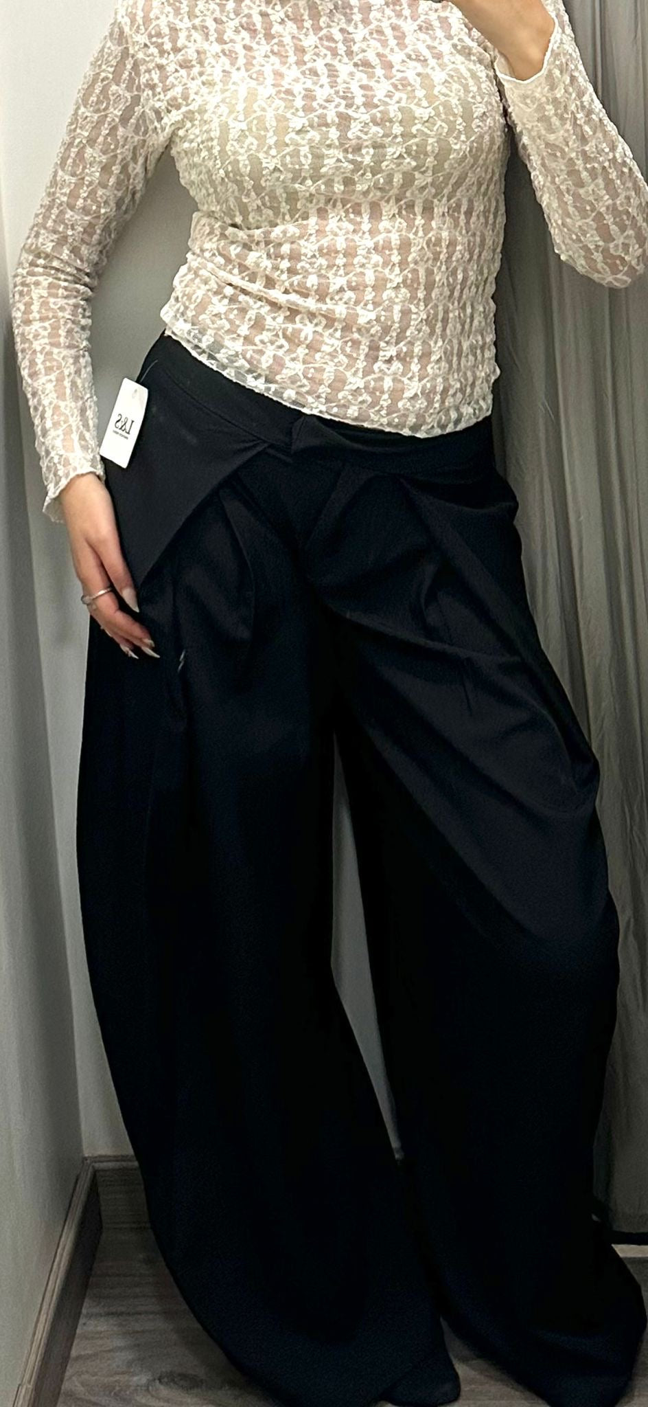 Pantalone donna palazzo, cateterizzato da ampia pence sul davanti. Abbottonato con un bottone e lampo ed elastico dietro. Taglia unica, veste dalla S alla XL