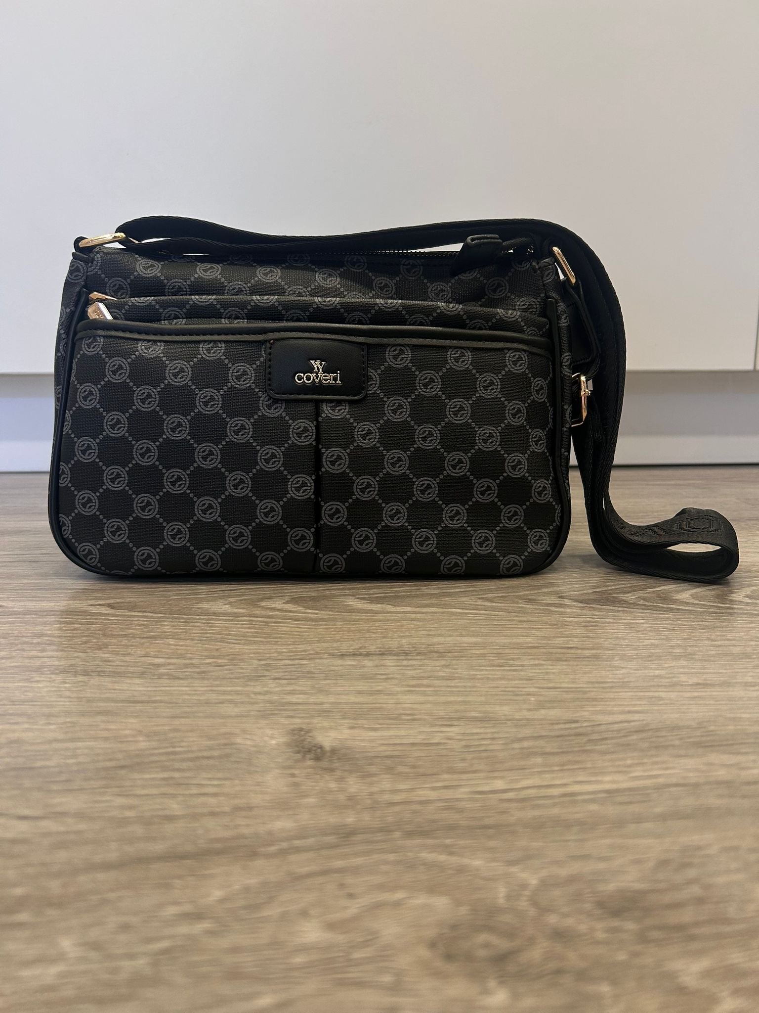 Comoda borsa postina in similpelle fantasia con tracolla regolabile e varie zip sul davanti firmata Coveri