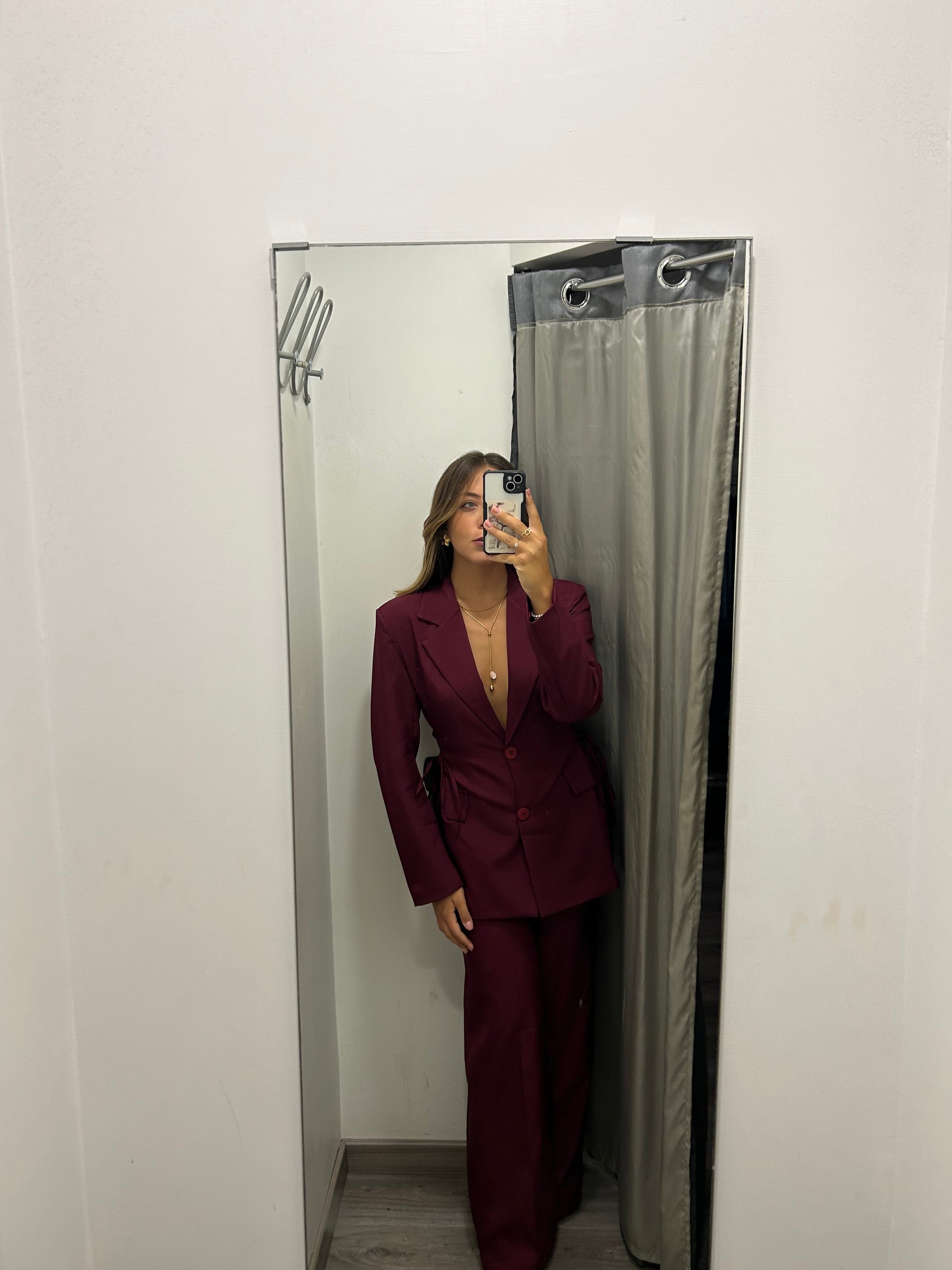 Tailleur monopetto, tg.unica, con lacci regolabili nei lati, pantalone palazzo con bottone ed elastico in vita. Veste da una XS a una L.